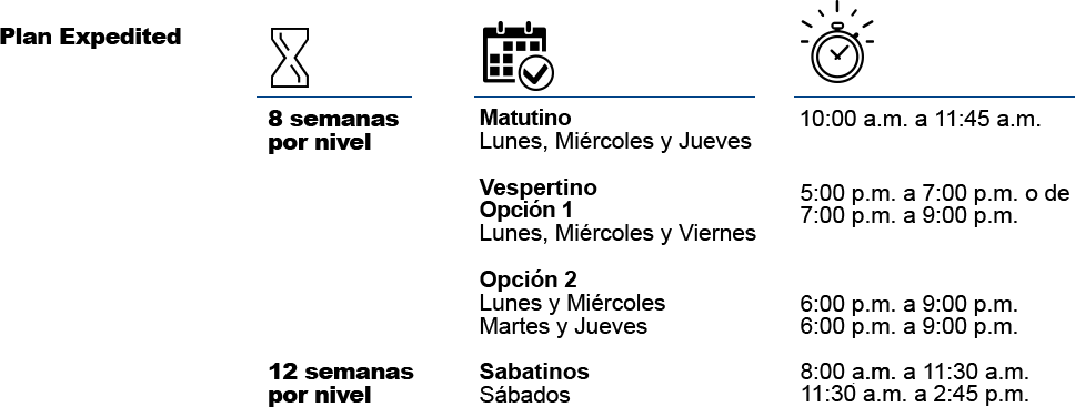 Todos los niveles tienen una duración de 8 semanas por nivel para los programas de entre semana y 12 semanas por nivel para el programa sabatino.