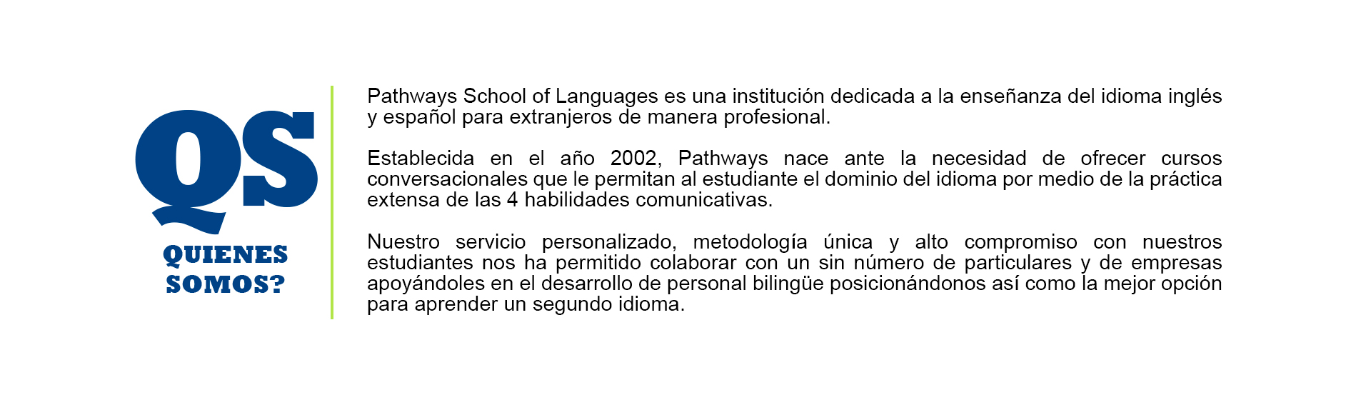 Establecida en el año 2002, Pathways nace ante la necesidad de ofrecer cursos conversacionales que le permitan al estudiante el dominio del idioma por medio de la práctica extensa de las 4 habilidades comunicativas.