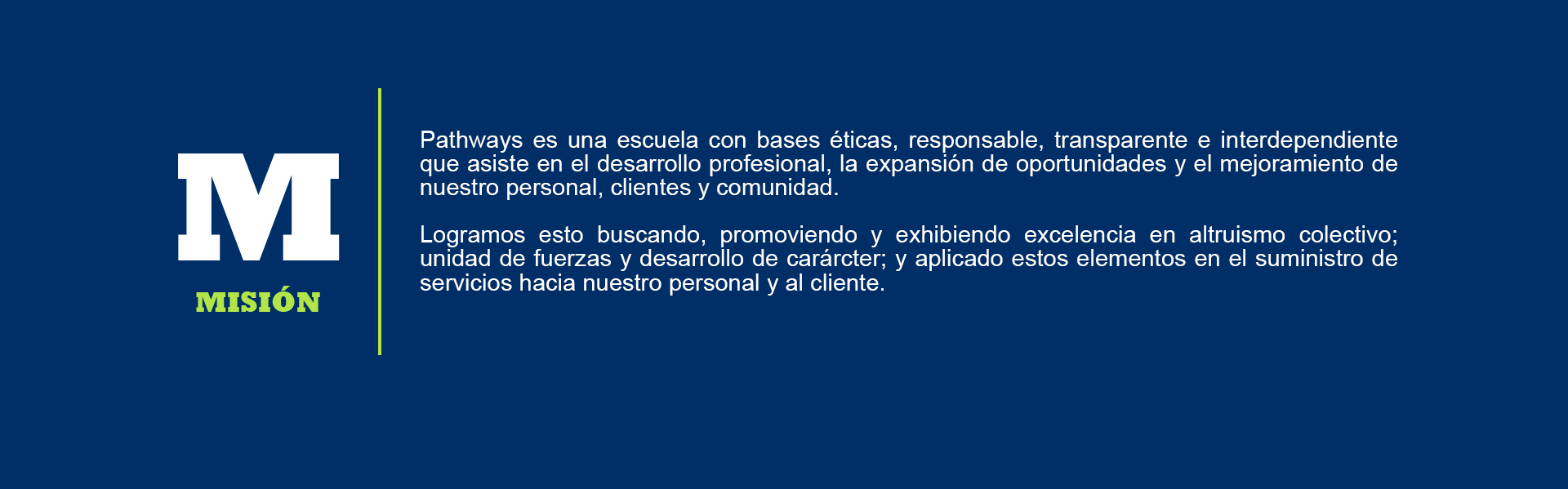 Pathways es una escuela con bases éticas, responsable, transparente e interdependiente que asiste en el desarrollo profesional, la expansión de oportunidades y el mejoramiento de nuestro personal, clientes y comunidad.